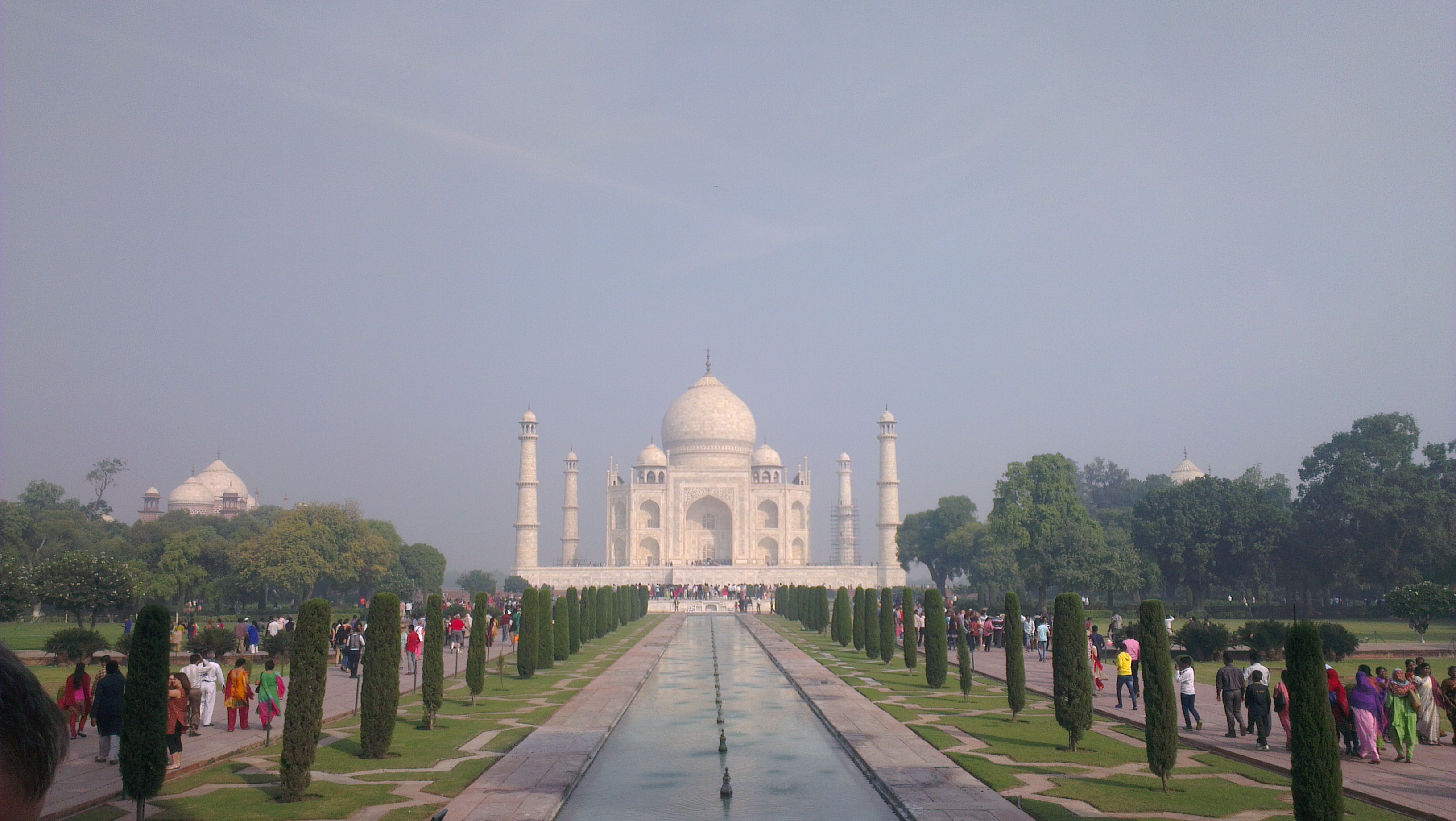 泰姬瑪哈陵的占地廣大,從前庭漫步經過正門後,映入眼簾的是蒙兀兒花園及盡頭的陵墓主體。花園中間的長形大理石水池時常浮現陵墓清晰倒影,十分美麗。水池兩側均是柏樹,在這裡能一睹這世界上偉大建築的完整奇觀。陵墓主體四角各有一座向外傾斜十二度的圓柱形高塔,以防止地震時向陵墓主體倒下。