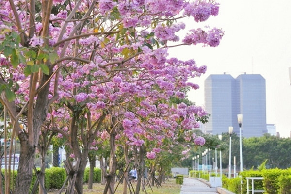 ▲ 前鎮河畔成排的洋紅風鈴木,適合春日散策 (圖取自高雄市政府養工處)。