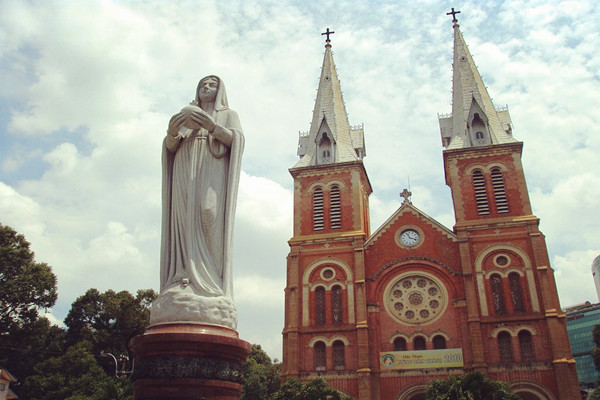 來到胡志明市,怎可錯過殖民時期所遺留下的古蹟建築!座落在第一郡的西貢聖母大教堂,或稱紅教堂,是市區內的知名地標。這座百年紅磚建築,建於法國統治越南時期,仿造巴黎聖母院的鐘樓,兩座鐘樓與教堂前面的花園廣場,洋溢著明快浪漫的法式氛圍。