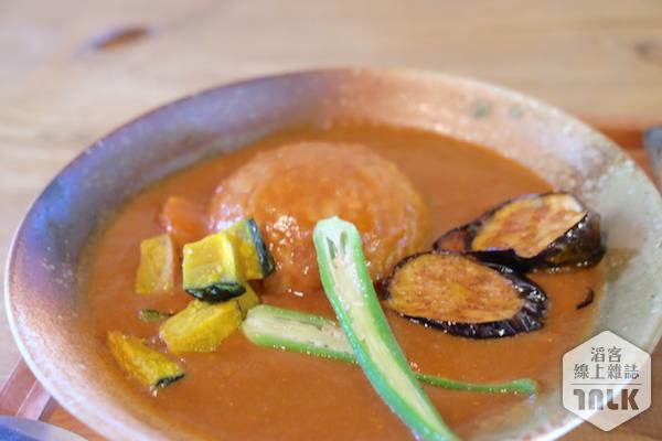 店裡的招牌是咖哩飯。這份日式咖哩可說是蔬菜滿點,使用當季的新鮮蔬菜,九月的咖哩有秋天的味道,秋葵,南瓜,茄子都入菜了。微辣的濃郁咖哩和白飯有著絕妙的搭配。店裡的套餐,附上了一杯冰涼的麥茶和爽脆的漬物。