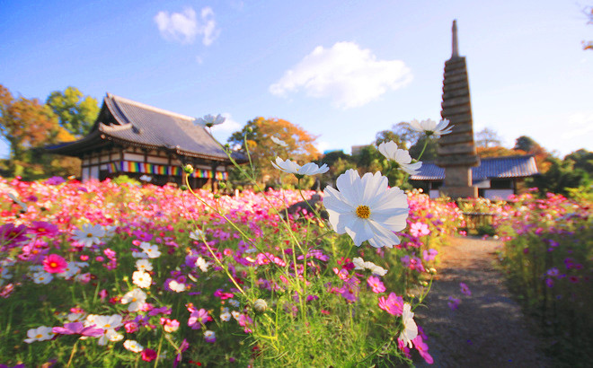 有「大波斯菊寺」美稱的般若寺,建於飛鳥時期,是日本最古老的秋櫻名所。多多迎風搖曳的波斯菊映襯著寺內十三重石塔等重要文物,簡約輕新的感覺,令人彷彿穿越了時空隧道。