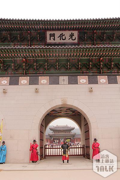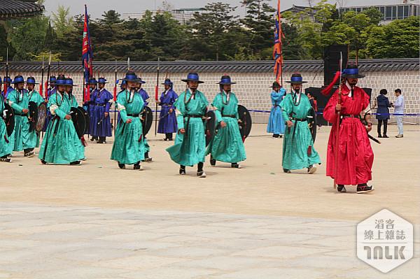朝鮮時代的門將交接在二十一世紀的南韓民主政體中以每小時為單位交接站崗,歷史傳統的維持取代了保宮衛國的功能。嚴響之時,黃袍紅衫的守門將與紅袍藍衫的從事官帶領著士兵步入交接,鮮色緞面衣著配著長刀、大旗透過陽光成像在眼中的絢麗肅穆停止了一切鼻息。三嚴響起,交接結束,圍觀者散去便是等待下一個圍觀的開始。太陽底下看似平靜安詳的景福宮,只是當下的錯覺。