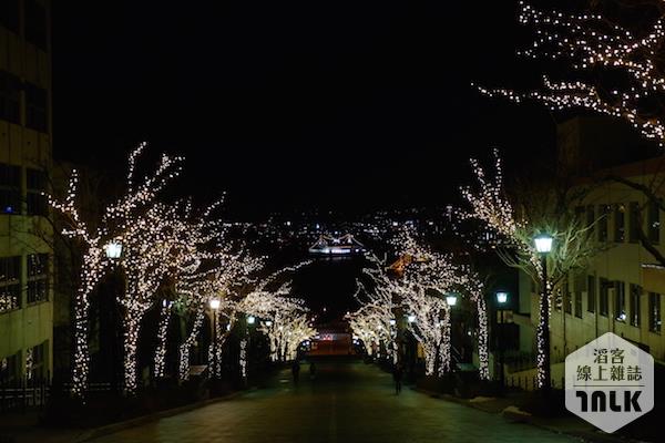 12月~2月冬季限定,魔法般的樹海點燈。 誰說點燈一定要華麗多彩,溫暖的單色黃燈,也能塑造出如夢境般的美景。白天能觀賞到函館灣的八幡坂,夜間幻化成美麗的燈海,車道旁的路樹,著上了閃亮黃燈泡後瞬間化身了耀眼的燈海。觀賞的最佳角度是由斜坡的最上端,最能感受夜景的魅力。