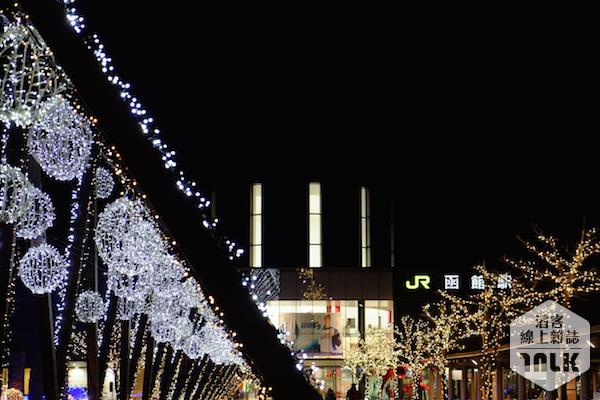 函館站前廣場,目前正舉行『光之道路』冬季的期間限定點燈。使用北海道生產的『道南衫』搭建成三角型,象徵函館山的造型隧道,燈泡則象徵著釣捕花枝的漁火,整體營造出了,寒冷冬季裡的溫暖小空間。點燈時間由日落~晚間10 點,點燈期間至2017年2月底。