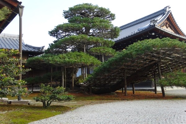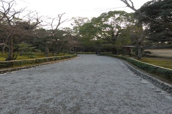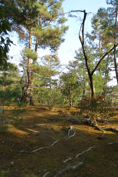 經過至高點夕佳亭後,可以到一字寫經場寫下一字的祝福,也可以繞回到書院廣場,停駐在陸舟之松前,陸舟之松是一顆松樹及沿著用竹子建造陸舟造型的樹葉所構成,從足利義滿到室町幕府的滅亡,六百多年未曾受波及,這也是一休和尚卡通中,一休面見足利將軍的所在。