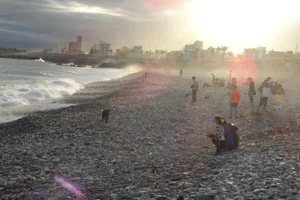 北濱公園有人在漫步,也有人在打沙灘排球,但見一群人,可能是遊客可能是花蓮當地人,隨意或坐或躺在小石子的海灘上,只見大伙對一漲一退的浪潮很感興趣,時間規律變化,週期性一上一下,小黑狗的吠叫聲傳遞在海潮中。
