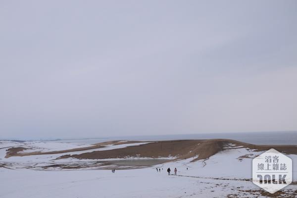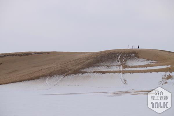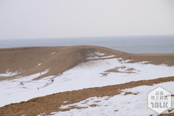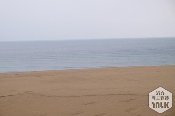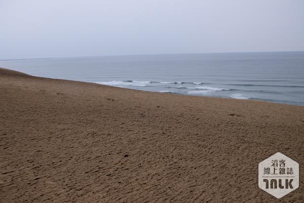 下車後,依照指標往沙丘入口,先爬上幾階陡峭階梯後,抵達一個平台,在此放眼能看到遼闊的沙嶺,就如同是一座海邊沙漠。 仔細往前方看,能看到遠遠處有個像馬背般的大斜坡沙丘,因為是一個巨大的斜坡,而讓爬坡的旅客顯得十分渺小。慢慢的往沙丘的高處前進吧!爬上高大的丘嶺後,迎向的是一望無際的日本海。