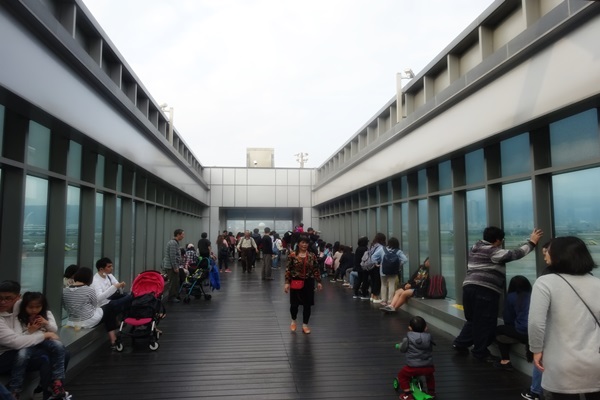 在松山機場的三樓有一座觀景台,從入口設計到動線規劃,極適合話家常之所在。二樓有摩斯漢堡可以放鬆,三樓有咖啡座椅可以享受。廣場的左手邊介紹在松山機場的各個航空公司之簡介,再往前走一些。透明玻璃的立方體設計,任君選擇不同角度觀看飛機,觀看地勤人員搬運行李、右前方的飛機降落、左前方的飛機起飛。這種近距離地觀看,彷似平凡中做一點出國的夢想,欣羨妒忌交雜相伴。