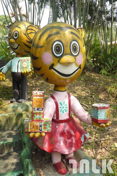有別於一般的豪宅別墅,名為別墅實為知識型主題公園的虎豹別墅充滿色彩鮮豔的巨型雕塑,多數建築採小橋流水、假山亭塔的中國園林式,整座公園活脫是個活生生的中國古典神話故事書,白蛇傳、西遊記、二十四孝、蘇武牧羊、十殿閻羅…等。然而,除了傳統中國神話、觀音、彌勒各路神外,其中穿插著日本相撲、紐約自由女神、暹羅傳統舞蹈、澳洲袋鼠等異國特色,沒有系統的突兀夾雜在各種中國文化雕塑中卻產生了另一種跳tone的幽默,國際化的思維設計在當時堪稱一絕。當然,身為虎豹別墅有一項不可或缺的則是自己品牌的推銷,兩個日本相撲中間的幾罐虎標萬金油、酷似巧連智巧虎的虎兄妹手中捧著各式虎標產品,在這個時代看來最不給力的一種軟性推銷模式給人純樸親切的莞爾。