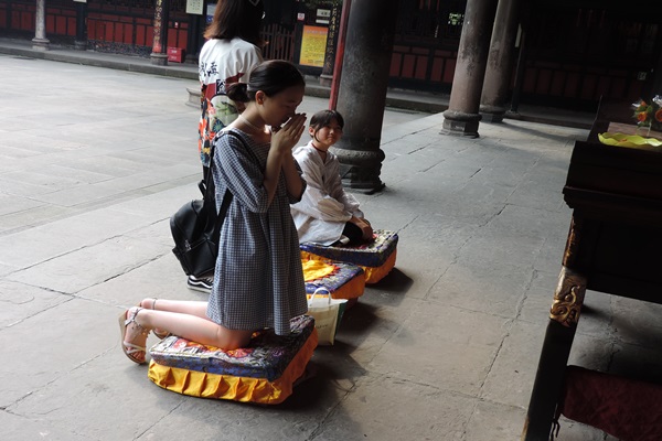 廟宇與一般日常生活的結合即在於虔誠地對一個生硬卻看似有靈性的東西傾訴,在文殊院每一個大殿及廣場前都可以看到或多或少的男女老少在不同的神像面前合十靜默,亦或是雙腰直接彎下,企圖從最大的身體擺動中得到最深的感應。來了一個後又來另外一個,總沒有間斷,也難分清到底誰是遊客誰又是當地人,界線在虔誠中都亦模糊。