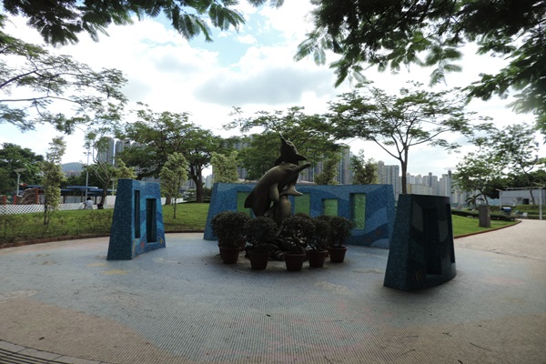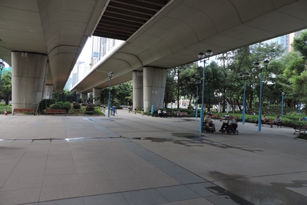 荃灣公園周圍由”荃灣新天地”及”荃灣廣場”包圍而成的,很像香港其他的公園,周圍盡是商場及高樓大廈。從公園內望向四周,好似井蛙觀天,卻永遠望不見香港人渴望的藍色天空。但讓它更特別的是頭頂上的五號高速公路穿過,公路地下種滿路樹,老人倚著綠樹聊天與頭頂上私家車快速通過的閃嘯形成對比;小孩悠閒嬉戲於草邊牆角與為了趕上班而快速經過公園的急促步伐形成差異。或許這種都市發展快速與人們生活空間的平衡所產生的差異在香港人眼中早見怪不怪,卻也成就外地人眼中獨特的荃灣公園。