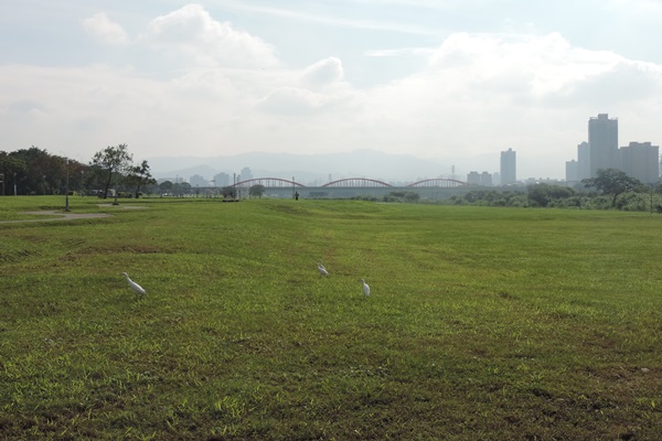 過了永福橋即進入中正河濱公園及華中河濱公園的範圍,腹地及道路於此更寬廣了,旅客在分岔路可以選擇左彎或是右拐,但不管你選怎哪個,那一片又一片的綠地總散布在你的左右手邊,在那片綠地上有白鷺三三兩兩嬉戲玩耍,有八哥從路燈頂端向下急速草坪水邊的劃過,有結伴成群的鴿子於樹下不停點頭地進食。從新店溪底的河套右轉即連上淡水河,約莫從雙園河濱公園與龍山河濱公園間的淡水河中間有一沙洲,這塊沙洲是野鳥的寶地,但見愛鳥人士群聚在野雁保護區的河岸草坪上用高倍望遠鏡捕捉因淡水河暫時退潮而在半濕半乾沙洲上緩緩跳動的雁鴨。