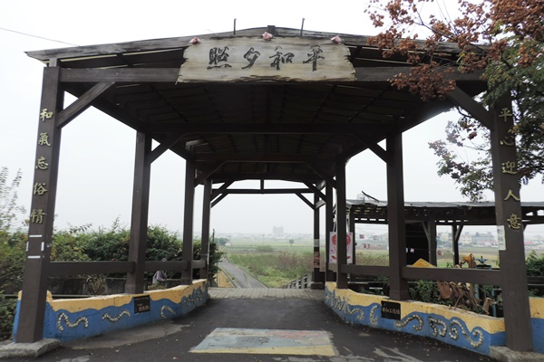 平和社區距離大村火車站差不多兩公里的路程,大約在中正西路的尾端也就是聖瑤宮的左手邊是一大片稻田,稻田的上方小平台寫著”平和夕照”四字,這四字橫高掛在木造小涼亭上,小涼亭的左手邊有一稻草人,從稻草人右邊的小石台即可清楚看到雙心池塘,這是田野版的雙心石滬,一顆小心緊貼另一顆大心,站在雙心邊,收遍黃油油的大村稻田。