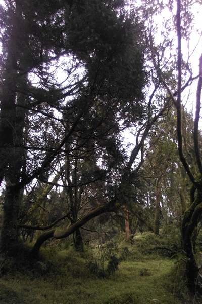 就像劍潭並非鄭成功親自將劍丟入的地方,卻因以訛傳訛直至今日的地名,同樣的荷蘭古道亦非荷蘭人曾經走過之所在,據當地史料,應該是清朝附近駐紮的軍營兵多是從河南移防過來的,河南及荷蘭的台語發音除音調些許不同外,可以說是同一發音。這條古道是漂亮的O字型,從萬溪左線產業道路往左行,經過風行咖啡觀光果園即是荷蘭古道的登山口,這條古道徹底將山外的陽光給隔絕,濃密異常的樹林將古道化作最自然的默劇場景,泥濘石路只容一人行走,時常需將雙腳密集交替於飄忽不定的樹根落腳點,時常需將雙手扶於尖尖鈍鈍的大小石頭重心上,三公里半的路程,有三次內雙溪小支流穿越其中,騰空雙腳及雙手並用是此時最好的應付之道,當經過這考驗,沿著迷地線,五指山草原即在眼前。