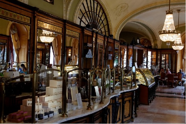 在知名旅遊網站tripadvisor榜上有名的Bookstore Cafe,位於極具現代感的Alexandra Bookstore的二樓。這間隱身於書店的咖啡館在19世紀時曾是奢靡的賭場與百貨公司,然而在20世紀赤化政權之下則改建為書店。其中當年裝飾最華麗的Lotz Hall則成為今日優雅炫目的Bookstore Cafe。Bookstore Cafe 牆面上與天花板的裝飾有金碧輝煌的壁畫、邊飾與水晶燈,讓每一個來到布達佩斯的旅人都能深刻感受到奧匈帝國當年的浪漫與奢華。重點是這樣的浪漫卻很親民,最簡單的一份咖啡或輕食蛋糕單價折合起來都不超過台幣100元。
