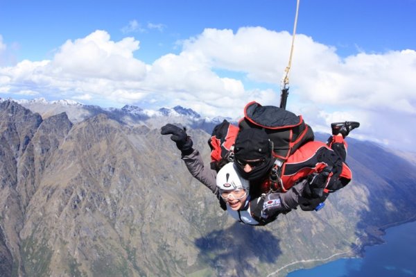 紐西蘭天然壯觀景緻一向動容人心,南島的皇后鎮(Queenstown)像走進明信片一般,美的不真實,整座城市被非常壯觀的群山環繞,景色變化萬千、湖光山色猶如仙境,是饒富盛名的旅遊度假勝地,當地活動除了悠閒漫步在城市街道上,體驗各式各樣刺激的旅遊活動也是必要,其中不能錯過的是高度冒險體驗雙人高空跳傘(Skydive)!