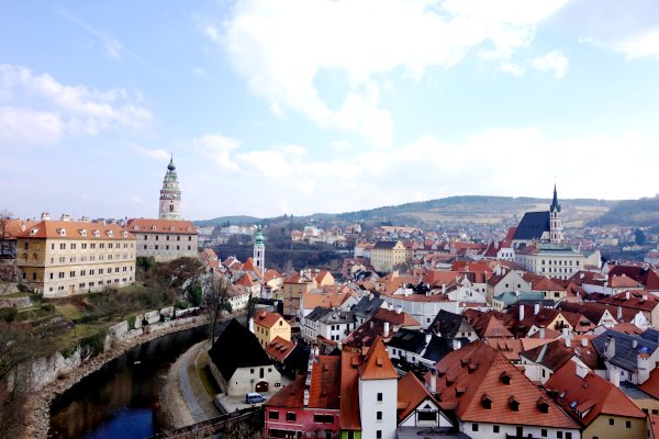 漫步老城區與經過拱橋之後,庫倫洛夫老城區最佳的觀賞點也在此驚豔遊客目光,最經典是從高處往下看,一覽無遺的盡是紅色屋頂與伏爾塔瓦河交織的畫面,如同玩具屋般的迷你可愛,遠方的高聳佇立的彩繪塔與城堡,讓整座城鎮更具層次,如此迷人的景色百看也不厭倦。