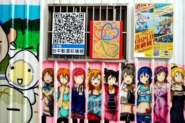從台中文學館步行大約20分鐘即可到達動漫彩繪巷,一般彩繪村在比較偏遠的郊區,但它在市區內容易到達也較少見。動漫彩繪巷不太長卻非常集中,有多樣化的動漫圖樣,瑪莉兄弟、小丸子、小叮噹、海賊王、幽遊白書、老夫子、Open醬…因此能勾起許多7年級生的卡通回憶。