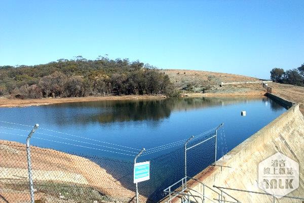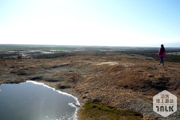 走上波浪岩的上方,山丘上非常平坦,部份坑洞積滿清澈的水,能看見魚兒在水裡悠遊景象。岩石由於無法吸收水份,雨水千萬年沖刷形成波浪岩,因而澳洲政府在此開闢水庫將雨水匯集,作為飲用灌溉水。
