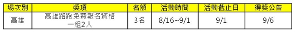 8.獎項說明:高雄路跑免費報名資格一組2人‧3名